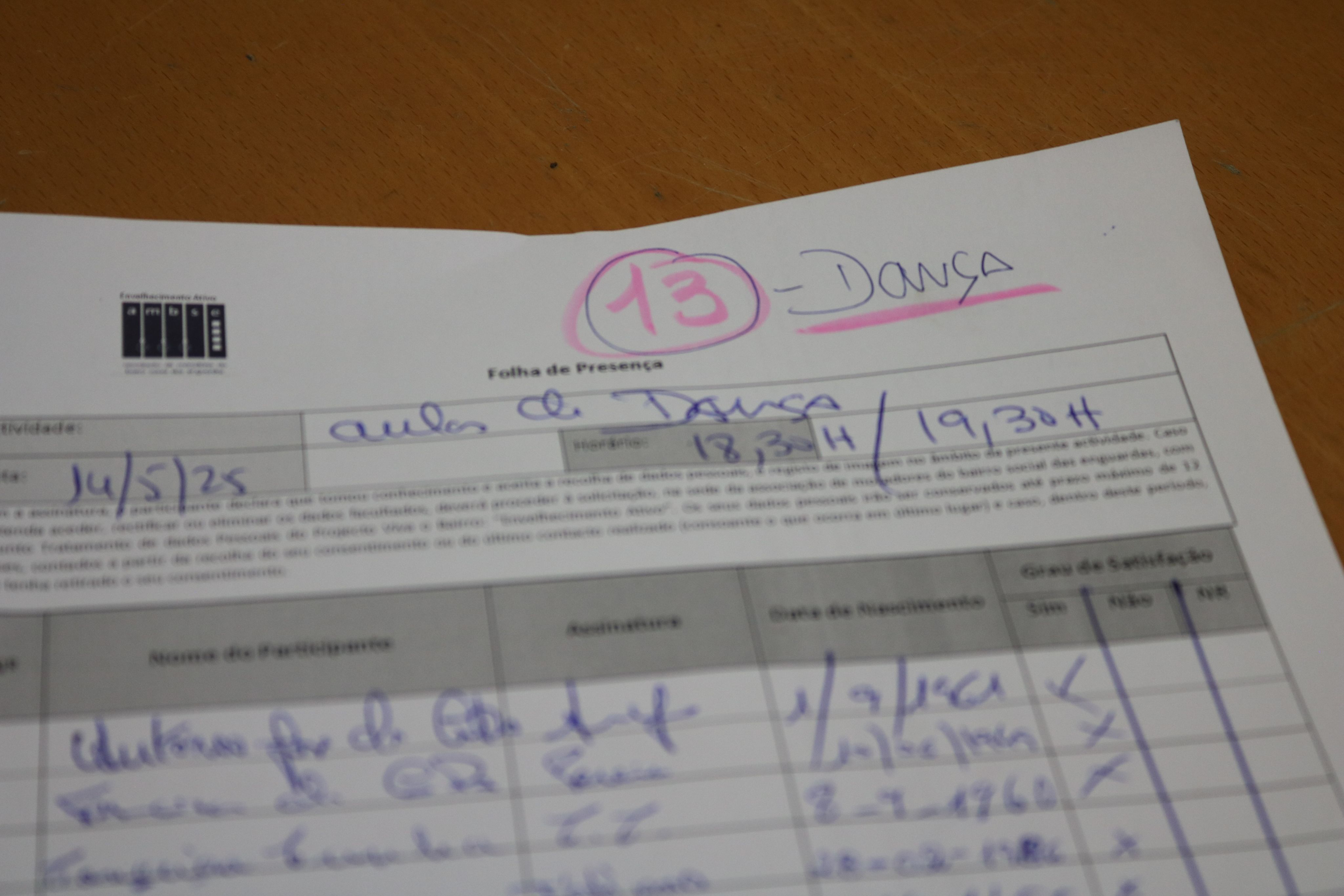 Folha de presenças da dança sénior