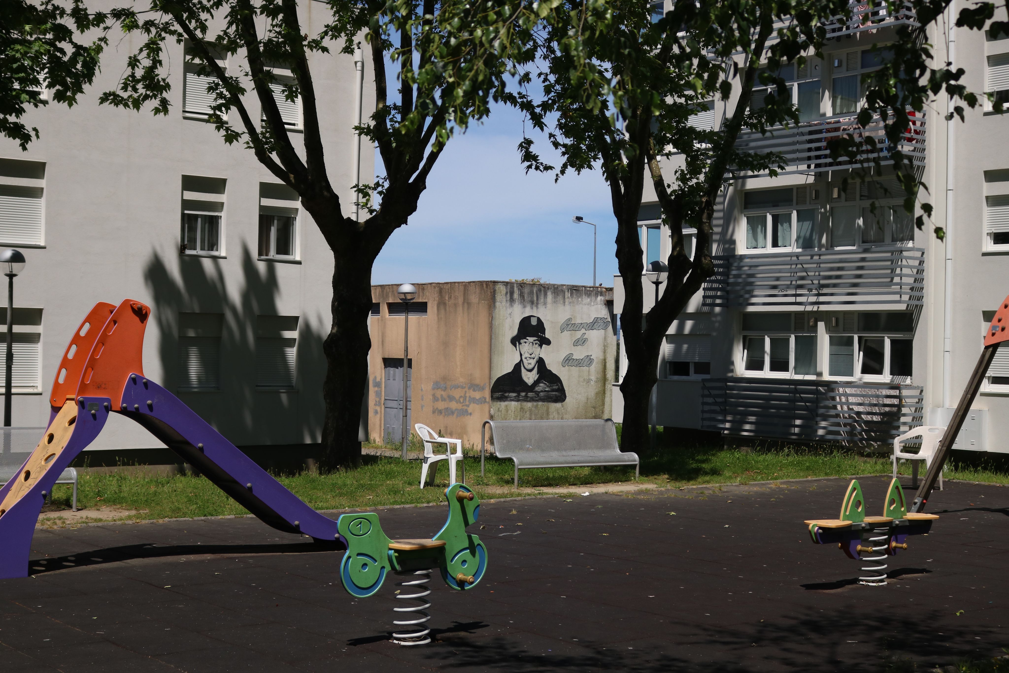 Mais atrás, há um graffiti nas traseiras de um edifício abandonado. Está escrito “Guardião do Guetto” ao lado do desenho de um antigo morador que lá morreu. Ouve-se uma máquina de barbear no outro lado da esquina. É alguém que faz a barba ao amigo. Junta-se uma senhora com uma criança ao colo e ficam a conversar.