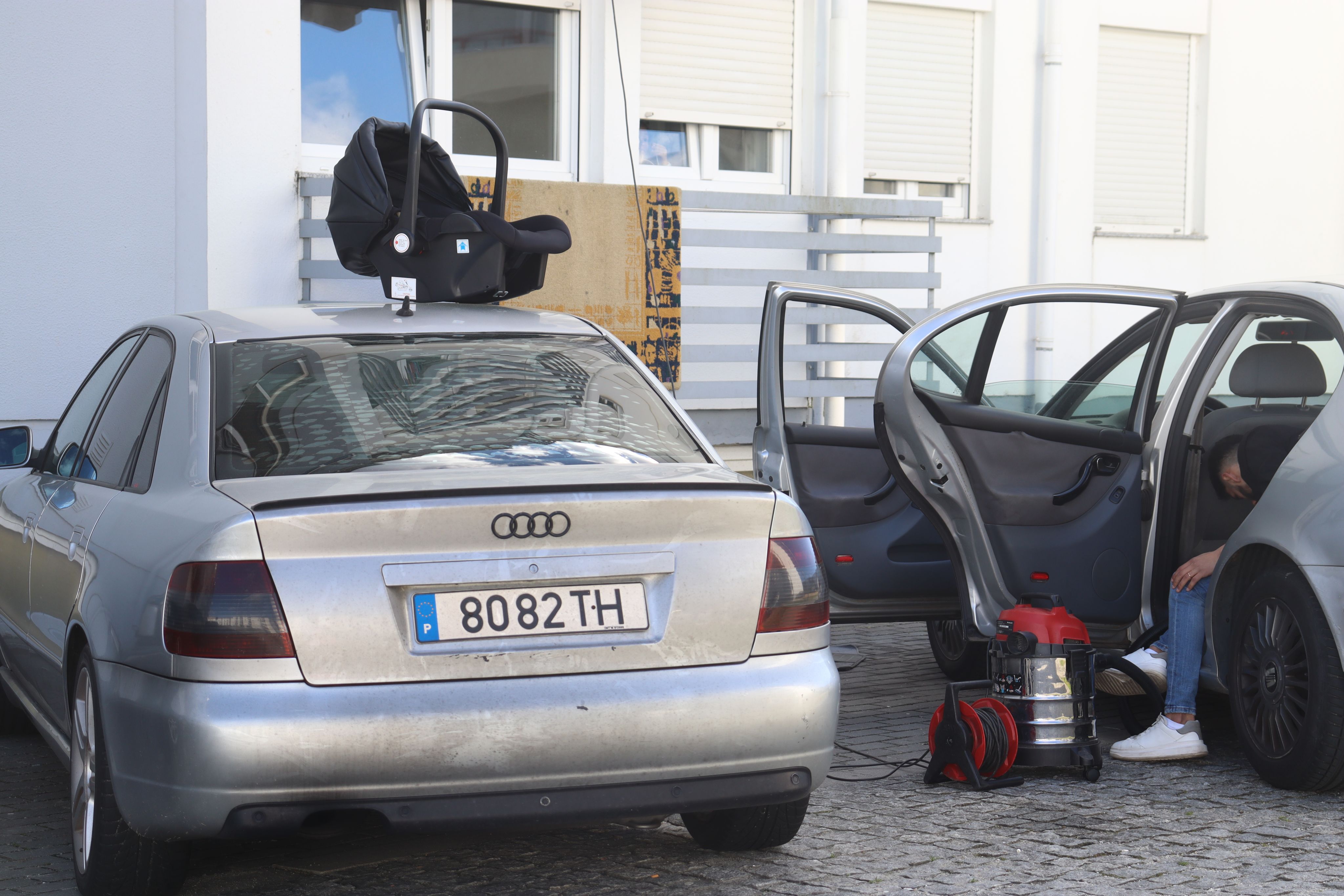 Morador a aspirar o carro e ouvir música