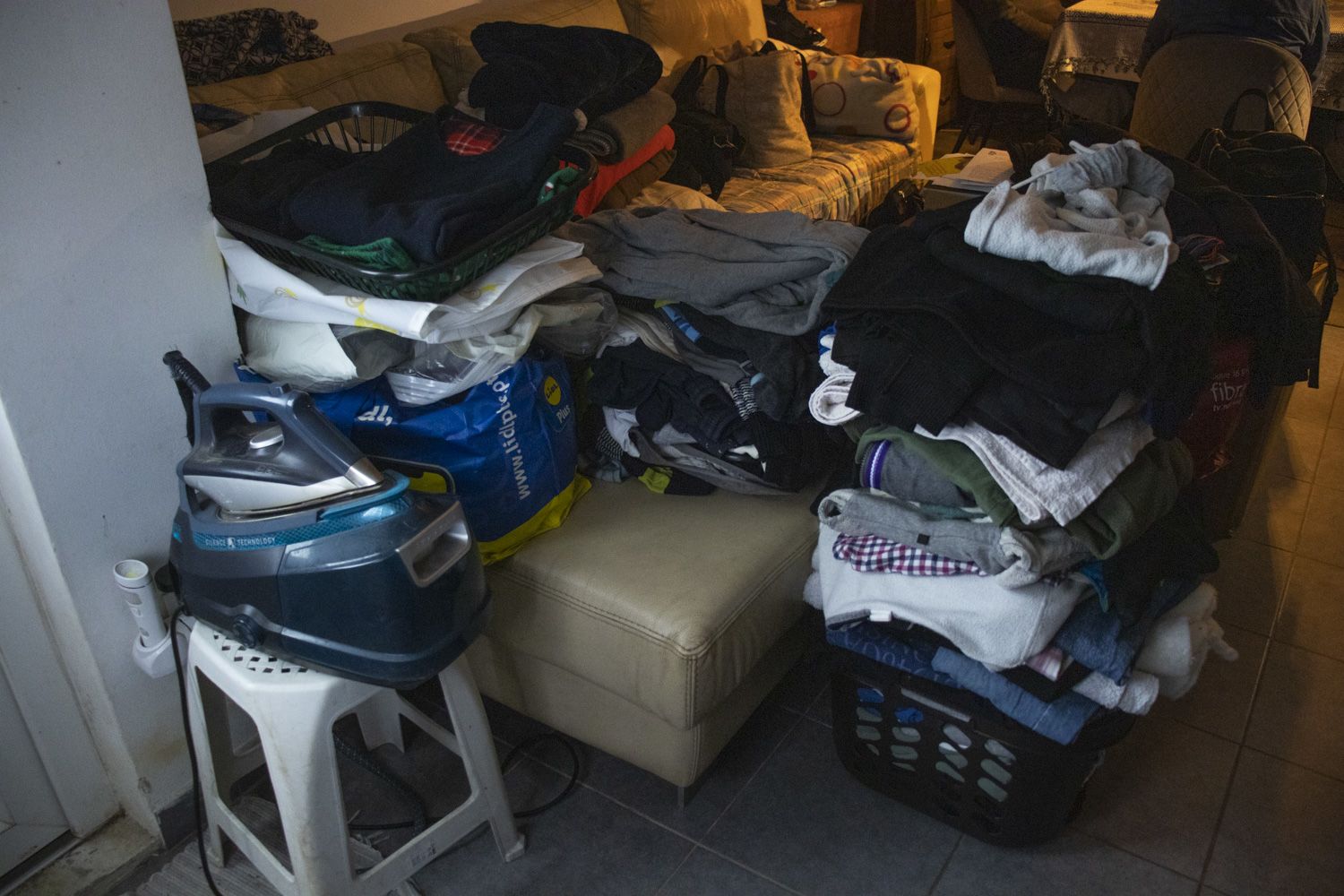 Cristina queixa-se. “O apartamento tem paredes a cair e água que sai do chão. O Samuel está permanentemente doente”. Sentam-se nas cadeiras da mesa de jantar porque o sofá está ocupado com montes de roupa. À frente está a televisão, a tábua de passar a ferro e o charriot com mais roupas penduradas.