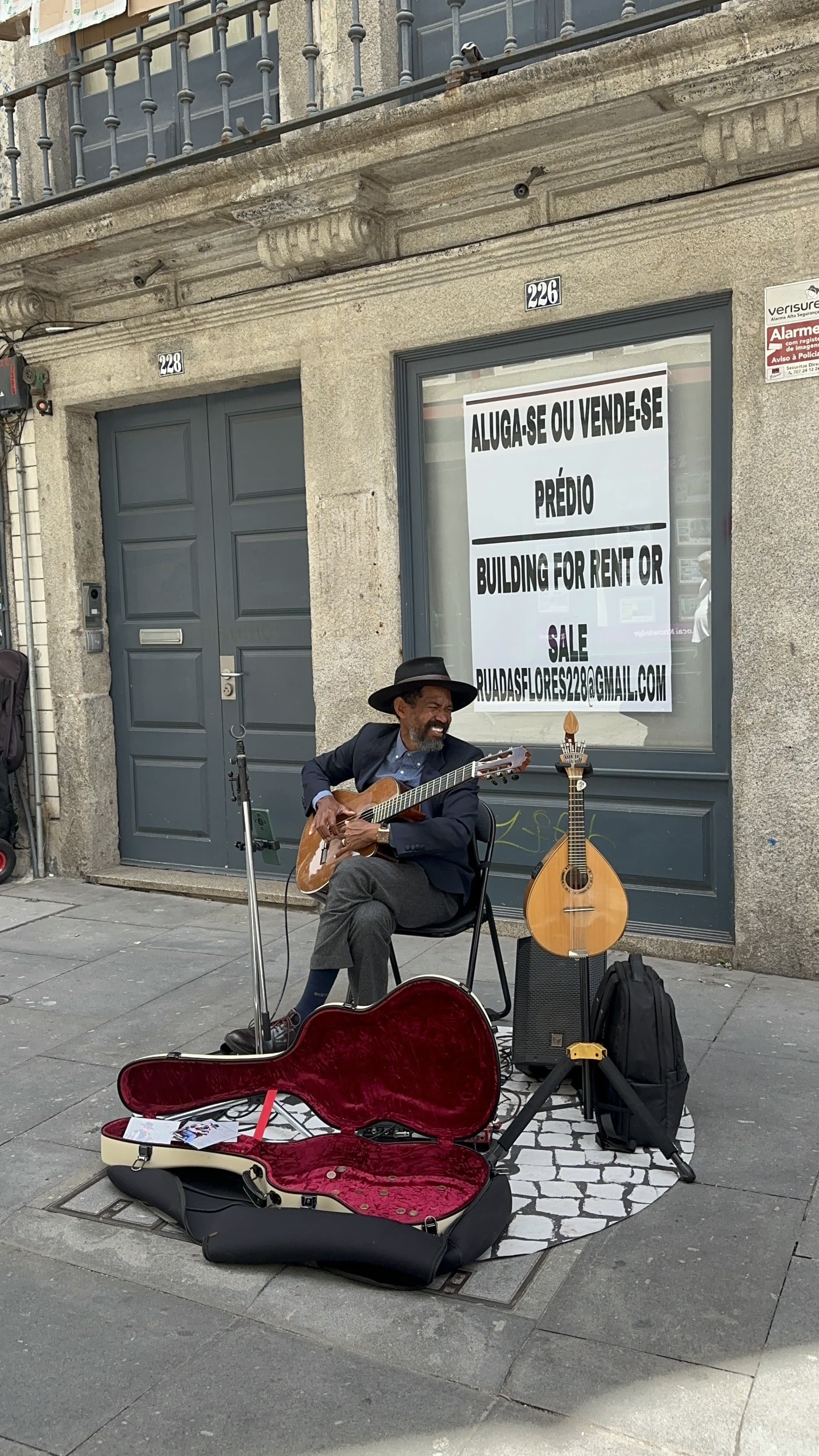 No chão, a capa da guitarra aberta. Algumas moedas repousam entre as dobras, como quem agradece em silêncio. Há quem deixe devagar, há quem nem abrande. Cada gesto conta.