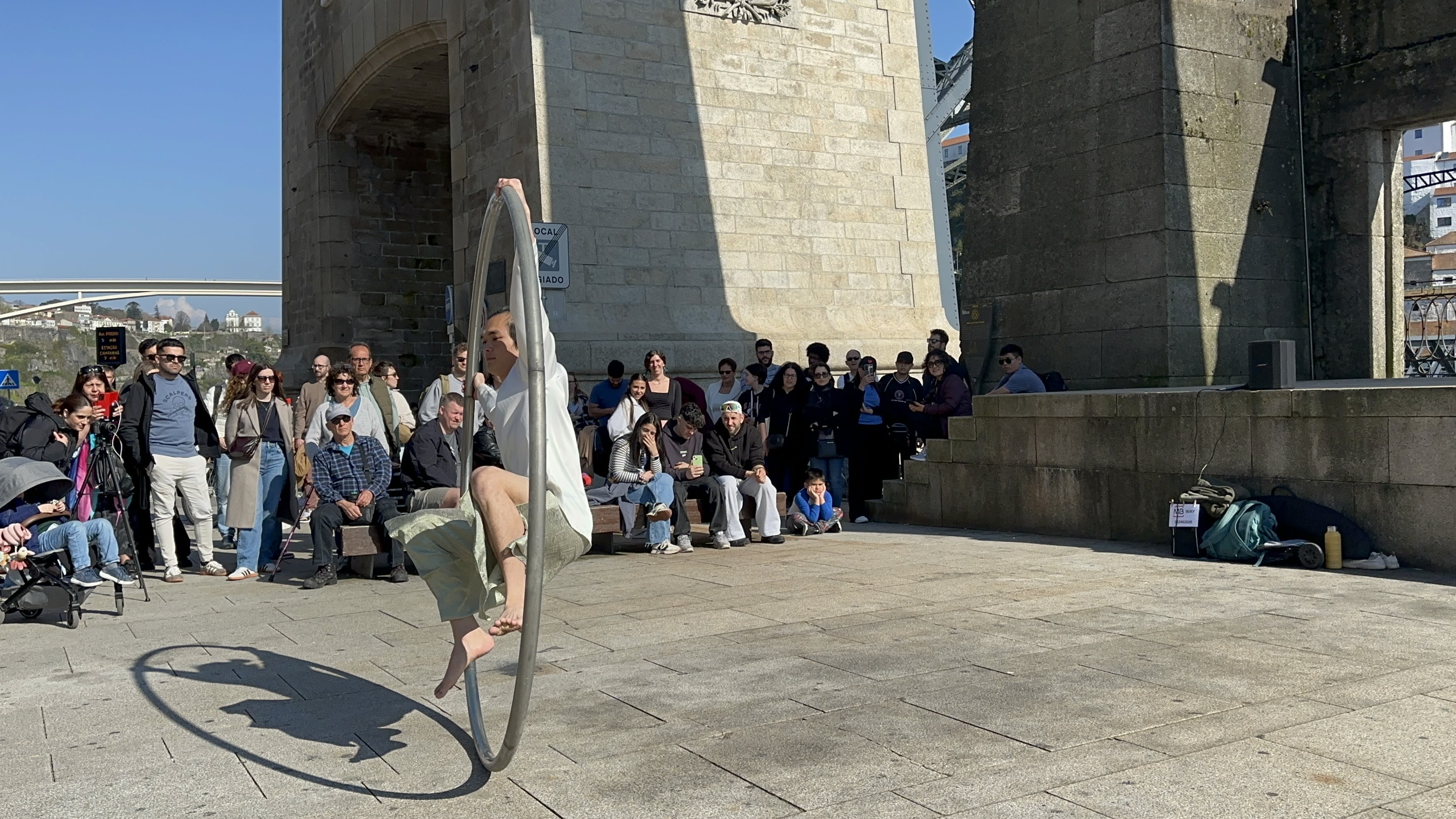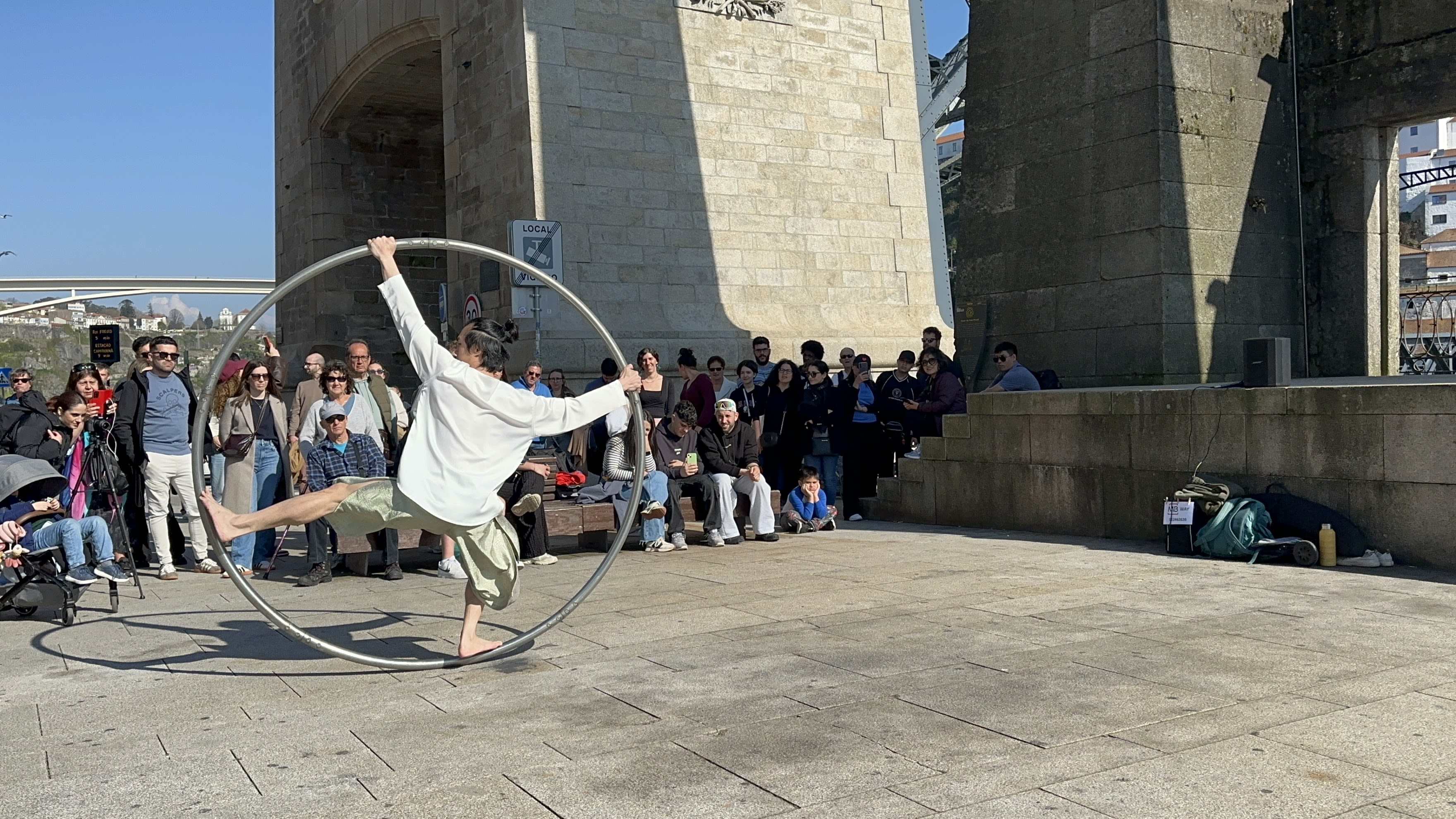 É sob o tabuleiro inferior da Ponte Luís I, onde o som do Douro se mistura com agitação dos carros, que Alvin Yong faz girar o corpo dentro de um aro metálico.