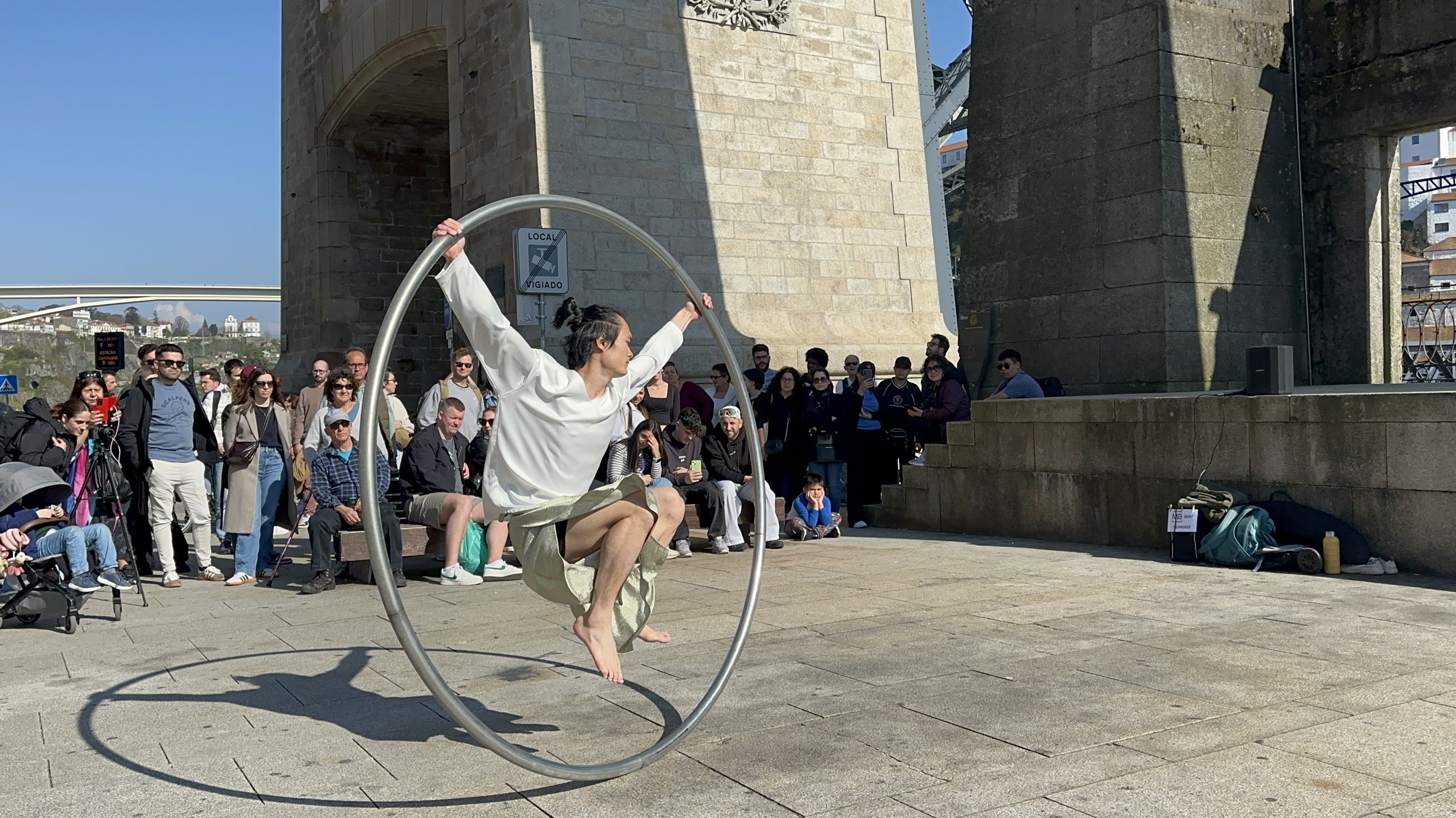 Chegou a Portugal para estudar numa escola de circo. Ficou por vontade — e por visto. Vive no Porto há quatro anos e meio. A rua, diz, não é apenas um palco improvisado. É onde constrói, todos os dias, o próprio caminho.