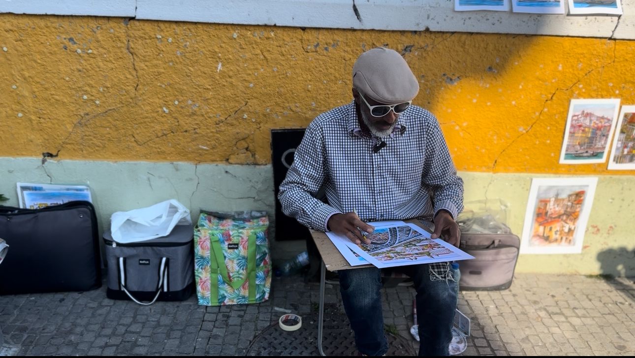 De camisa aos quadrados, chapéu claro e óculos escuros, segura a aguarela com a firmeza de quem já desenhou aquela ponte centenas de vezes.